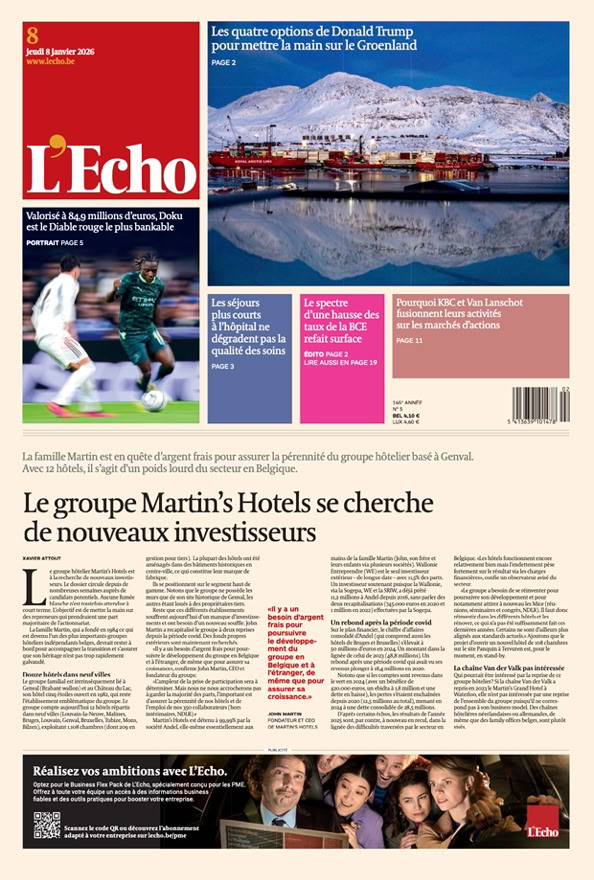 • Le groupe Martin’s Hotels se cherche de nouveaux investisseurs La famille Martin est en quête d’argent frais pour assurer la pérennité du groupe hôtelier basé à Genval. Avec 12 hôtels, il s’agit d’un poids lourd du secteur en Belgique p. 1