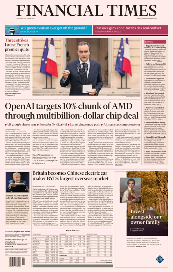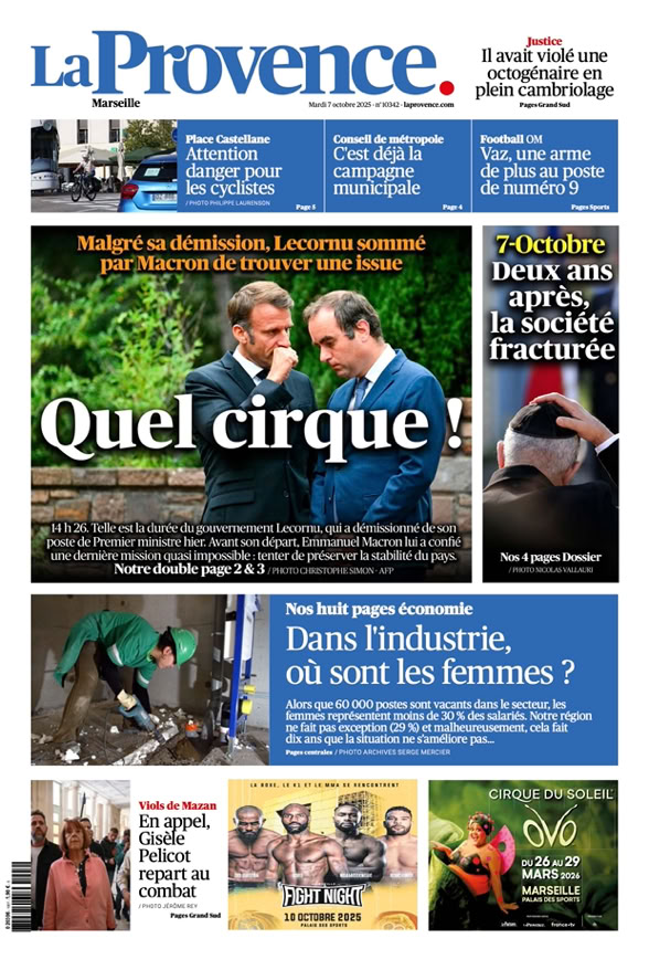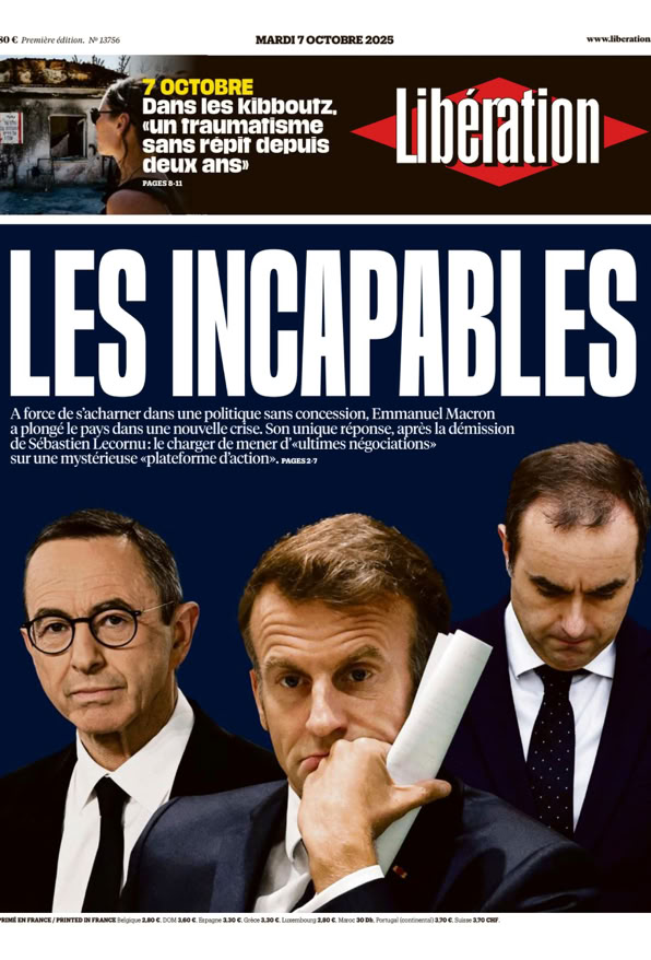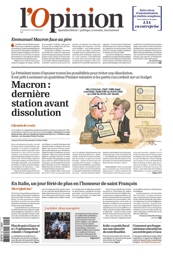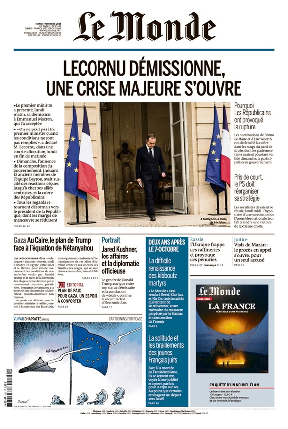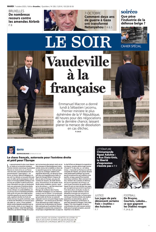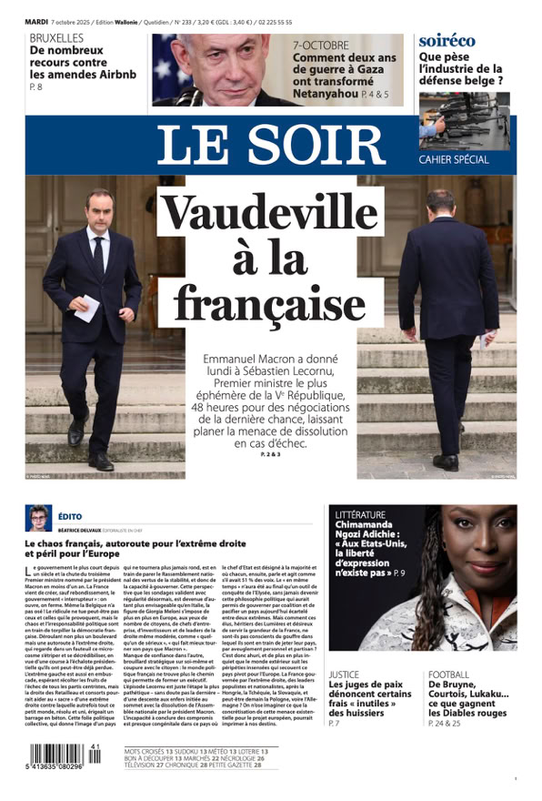 • Vaudeville à la française Emmanuel Macron a donné lundi à Sébastien Lecornu, Premier ministre le plus éphémère de la Ve République, 48 heures pour des négociations de la dernière chance, laissant planer la menace de dissolution en cas d’échec p. 2 - 3