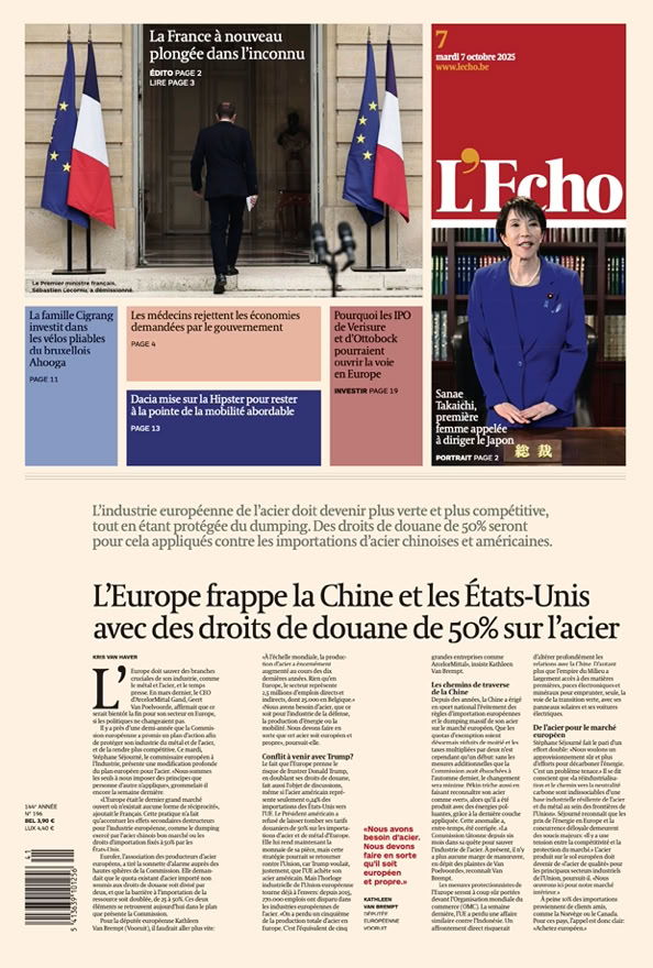 • L’Europe frappe la Chine et les États-Unis avec des droits de douane de 50% sur l’acier L’industrie européenne de l’acier doit devenir plus verte et plus compétitive, tout en étant protégée du dumping. Des droits de douane de 50% seront pour cela appliqués contre les importations d’acier chinoises et américaines p. 1