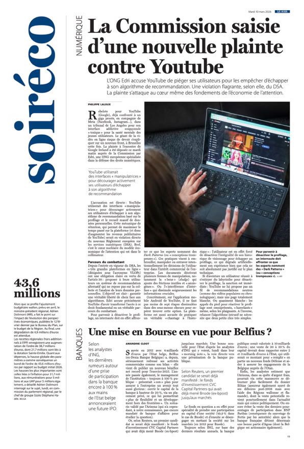 • SOIRÉCO Comment la réforme Jambon va impacter votre pension p. 14 | Augmenter la TVA : solution simple, effets complexes p. 16 & 17 | « YouTube manipule ses utilisateurs » : une nouvelle plainte p. 13