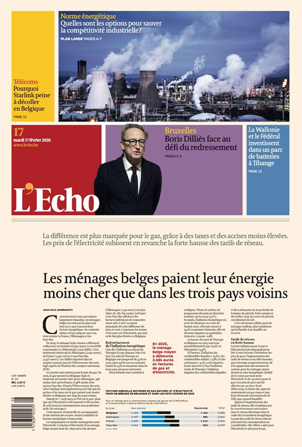 • Les ménages belges paient leur énergie moins cher que dans les trois pays voisins La différence est plus marquée pour le gaz, grâce à des taxes et des accises moins élevées. Les prix de l'électricité subissent en revanche la forte hausse des tarifs de réseau p. 1
