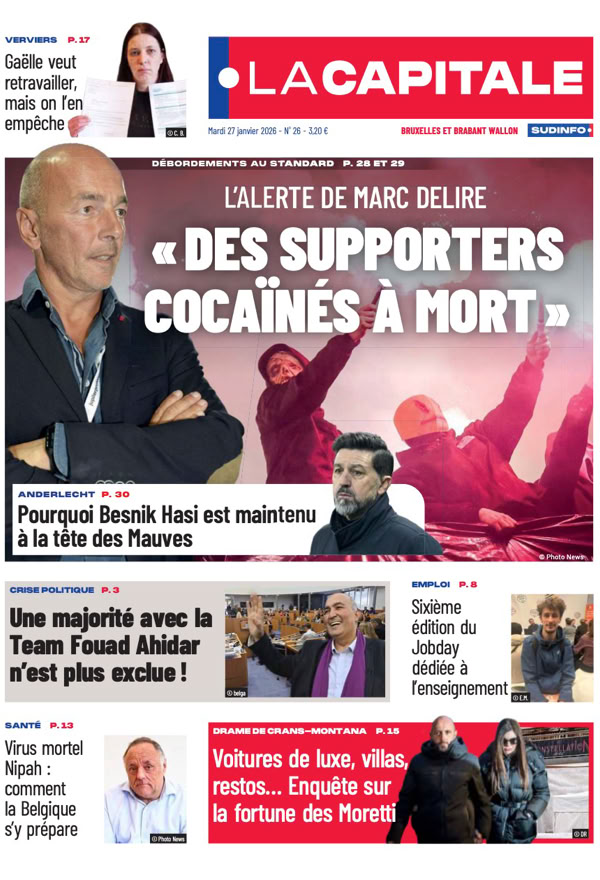 • Débordements au Standard L’alerte de Marc Delire « Des supporters cocagnes à mort » p. 28 - 29 + Anderlecht Pourquoi Besnik Hasi est maintenu à la tête des Mauves p. 30