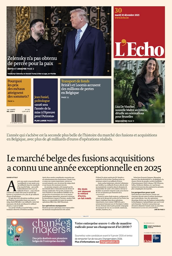 • Le marché belge des fusions acquisitions a connu une année exceptionnelle en 2025 L’année qui s’achève est la seconde plus belle de l’histoire du marché des fusions et acquisitions en Belgique, avec plus de 46 milliards d’euros d’opérations réalisés p. 3