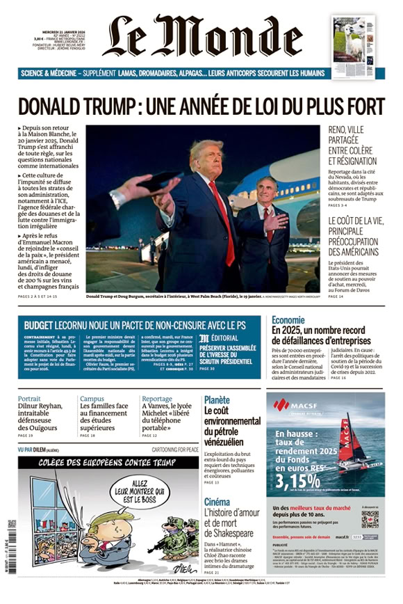 • Le Groenland dans le viseur de Trump Quelques heures à peine après la capture illégale du président vénézuélien Nicolás Maduro, Donald Trump a réaffirmé sa convoitise pour le Groenland. Ses menaces d’annexer l’île sont de plus en plus pressantes 4 pages