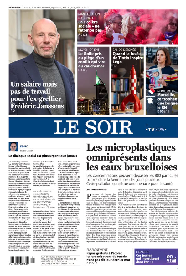 • Les microplastiques omniprésents dans les eaux bruxelloises Les concentrations peuvent dépasser les 800 particules par m3 dans la Senne lors des jours pluvieux. Cette pollution constitue une menace pour la santé p. 12