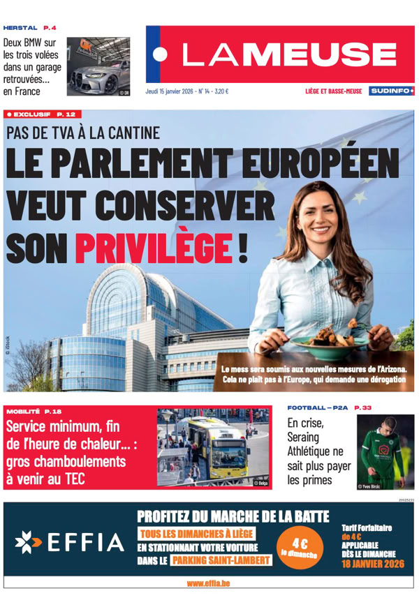 • Pas de TVA à la cantine Le Parlement européen veut conserver son privilège ! Le mess sera soumis aux nouvelles mesures de l’Arizona. Cela ne plaît pas à l’Europe, qui demande une dérogation p. 12
