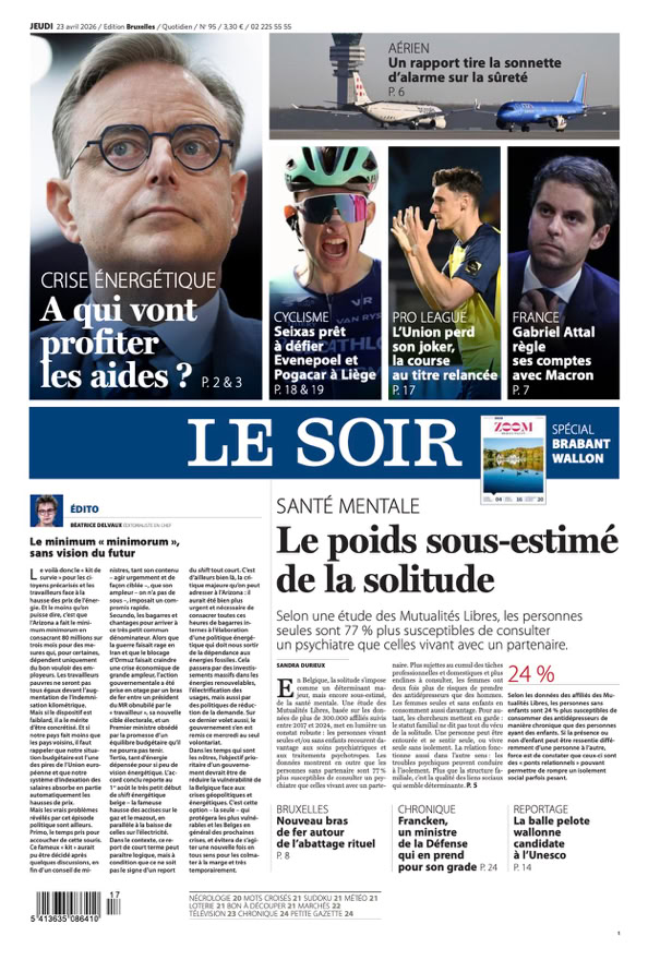 • Santé mentale Le poids sous-estimé de la solitude Selon une étude des Mutualités Libres, les personnes seules sont 77 % plus susceptibles de consulter un psychiatre que celles vivant avec un partenaire p. 5