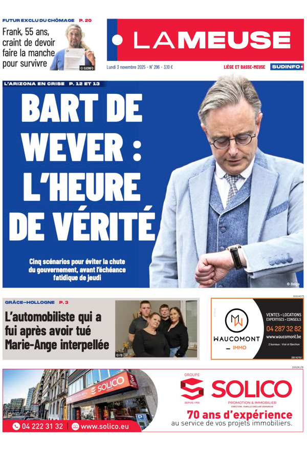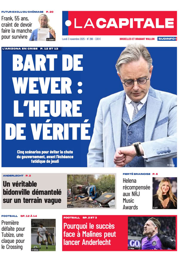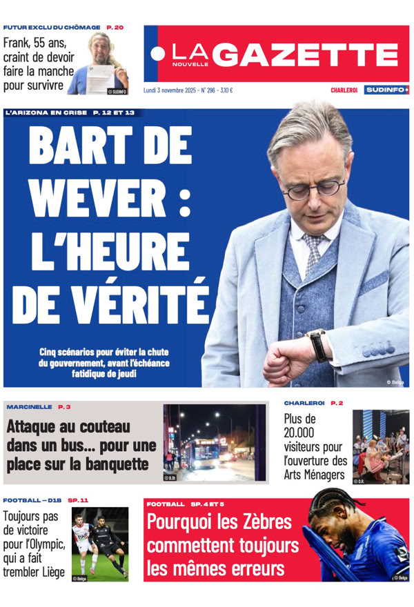 • L’Arizona en crise Bart De Wever : l’heure de vérité Cinq scénarios pour éviter la chute du gouvernement, avant l’échéance fatidique de jeudi p. 12 - 13