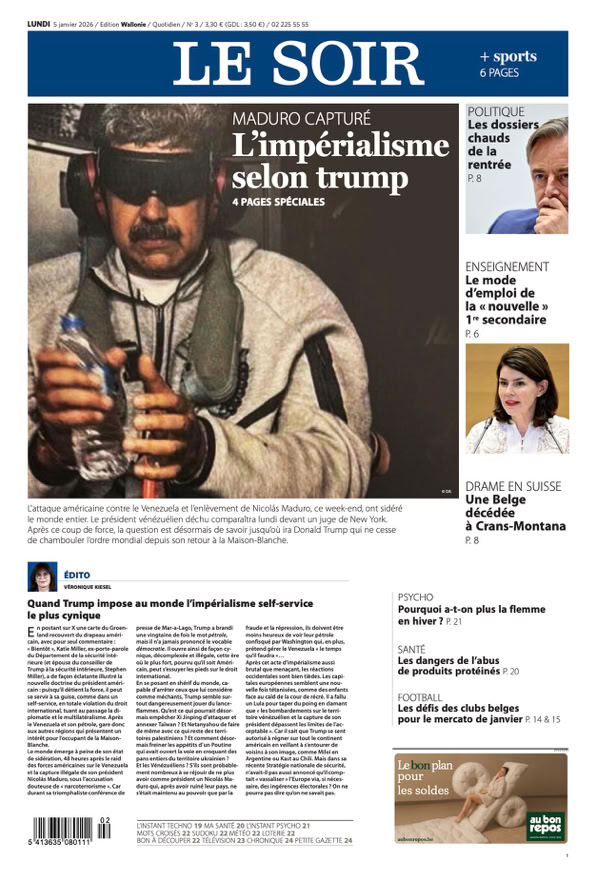 • Maduro capturé L’impérialisme selon Trump L’attaque américaine contre le Venezuela et l’enlèvement de Nicolás Maduro, ce weekend, ont sidéré le monde entier. Le président vénézuélien déchu comparaîtra lundi devant un juge de New York. Après ce coup de force, la question est désormais de savoir jusqu’où ira Donald Trump qui ne cesse de chambouler l’ordre mondial depuis son retour à la Maison-Blanche 4 pages spéciales