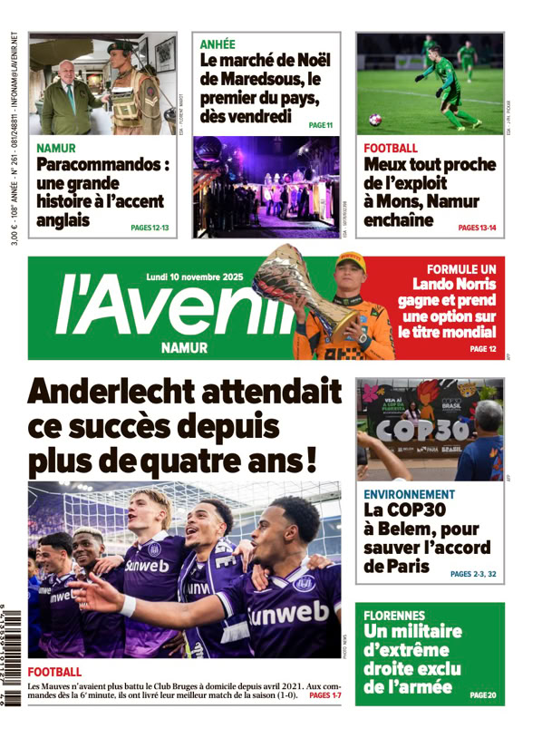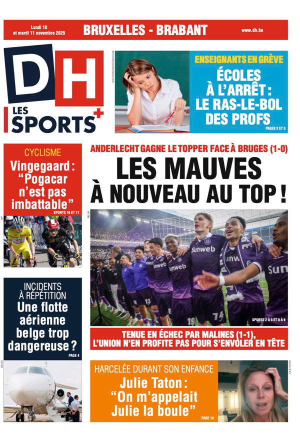• Anderlecht gagne le Topper face à Bruges (1-0) Les Mauves à nouveau au top ! + Tenue en échec par Malines (1-1), l’Union n’en profite pas pour s’envoler en tête p. sports 2 à 5 et 8 à 9