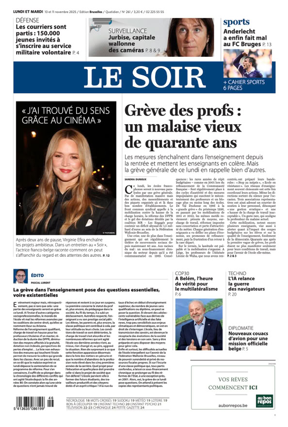 • Grève des profs : un malaise vieux de quarante ans Les mesures s’enchaînent dans l’enseignement depuis la rentrée et mettent les enseignants en colère. Mais la grève générale de ce lundi en rappelle bien d’autres p. 2 & 3