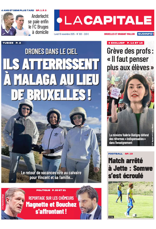 • Tubize Drones dans le ciel. Ils atterrissent à Malaga au lieu de Bruxelles ! Le retour de vacances vire au calvaire pour Vincent et sa famille... p. 2