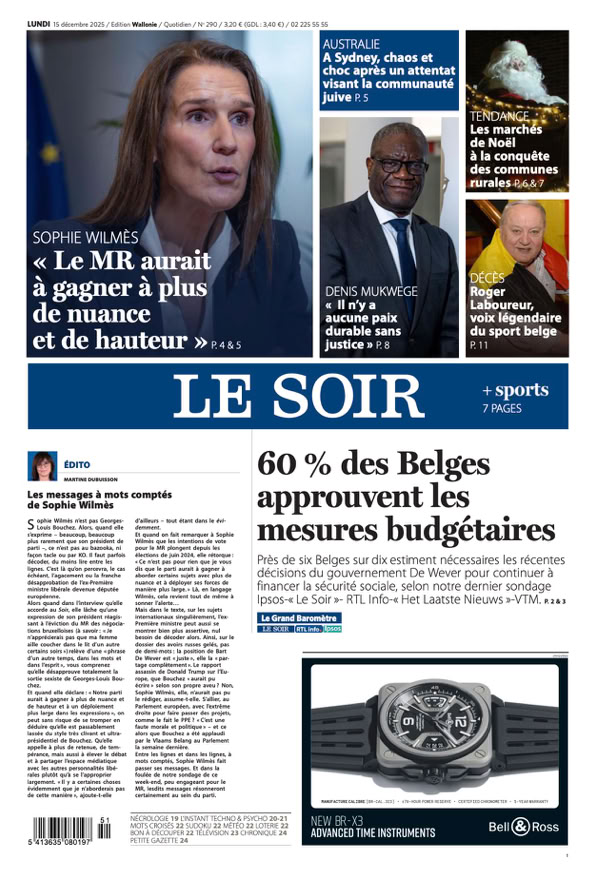 • Grand Baromètre 60 % des Belges approuvent les mesures budgétaires Près de six Belges sur dix estiment nécessaires les récentes décisions du gouvernement De Wever pour continuer à financer la sécurité sociale, selon notre dernier sondage Ipsos« Le Soir » RTL Info« Het Laatste Nieuws »VTM p. 2 & 3