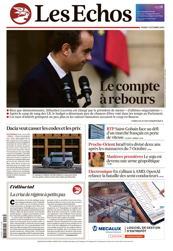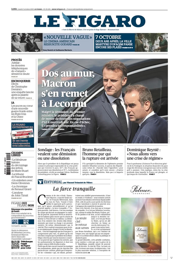 • Vaudeville à la française Emmanuel Macron a donné lundi à Sébastien Lecornu, Premier ministre le plus éphémère de la Ve République, 48 heures pour des négociations de la dernière chance, laissant planer la menace de dissolution en cas d’échec p. 2 - 3