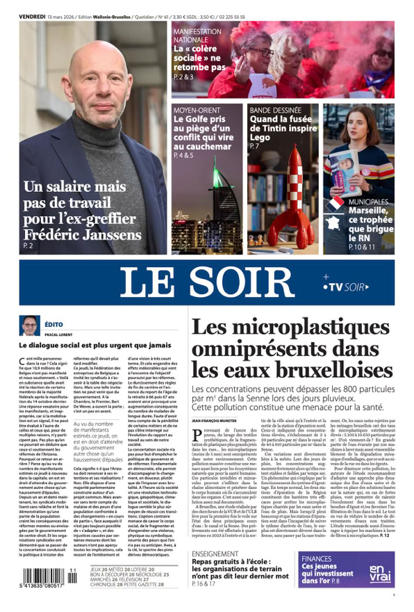 • Les microplastiques omniprésents dans les eaux bruxelloises Les concentrations peuvent dépasser les 800 particules par m3 dans la Senne lors des jours pluvieux. Cette pollution constitue une menace pour la santé p. 12