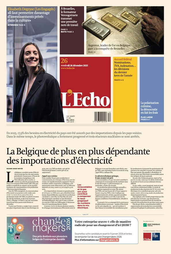 • La Belgique de plus en plus dépendante des importations d’électricité En 2025, 17,5% des besoins en électricité du pays ont été assurés par des importations depuis les pays voisins. Dans le même temps, le photovoltaïque a fortement progressé et trois réacteurs nucléaires se sont arrêtés. p. 1
